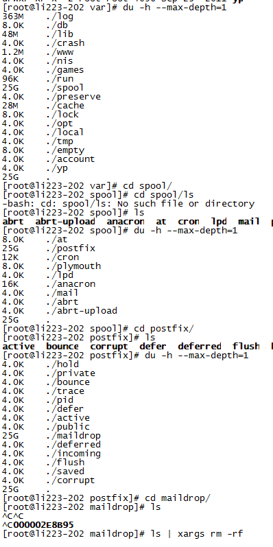 查看/var有25g的文件,是这个的原因,一路往下查,找到罪归祸首,/var/spool/postfix/maildrop/ 中有大量的文件