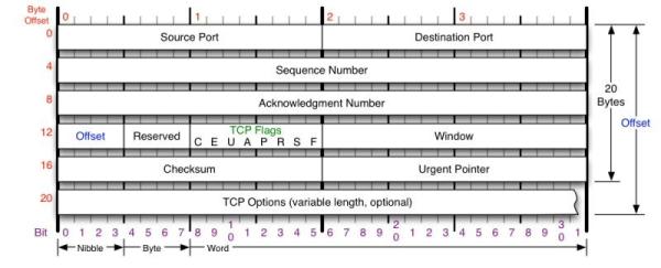 (5) Offset(TCP报文头长度):用于存储报文头中有多少个32bit(上图的一行),存储长度为4bit,最大可表示(2^3+2^2+2^1+1)*32bit=60bytes的报文头。最小取值5,5*32bit=20bytes。