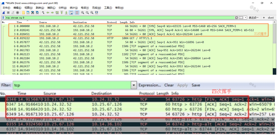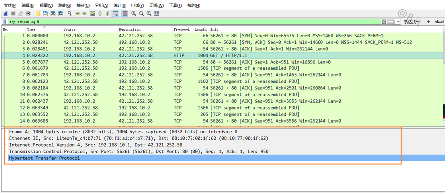 有多个TCP流时在显示过滤器中填入表达式:tcp.stream eq 0 筛选出第一个TCP流(包含完整的一次TCP连接:三次握手和四次挥手)