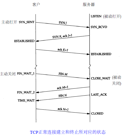 LAST_ACK::它是被动关闭一方在发送FIN报文后,最后等待对方的ACK报 文。当收到ACK报文后,也即可以进入到CLOSED可用状态了。(被动方)